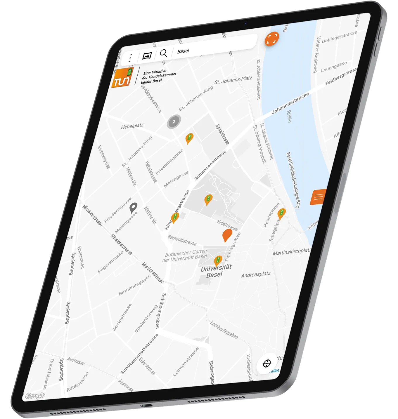 Users can explore MINT-related organizations in the Basel area through a highly interactive digital map with multiple viewing modes, including: